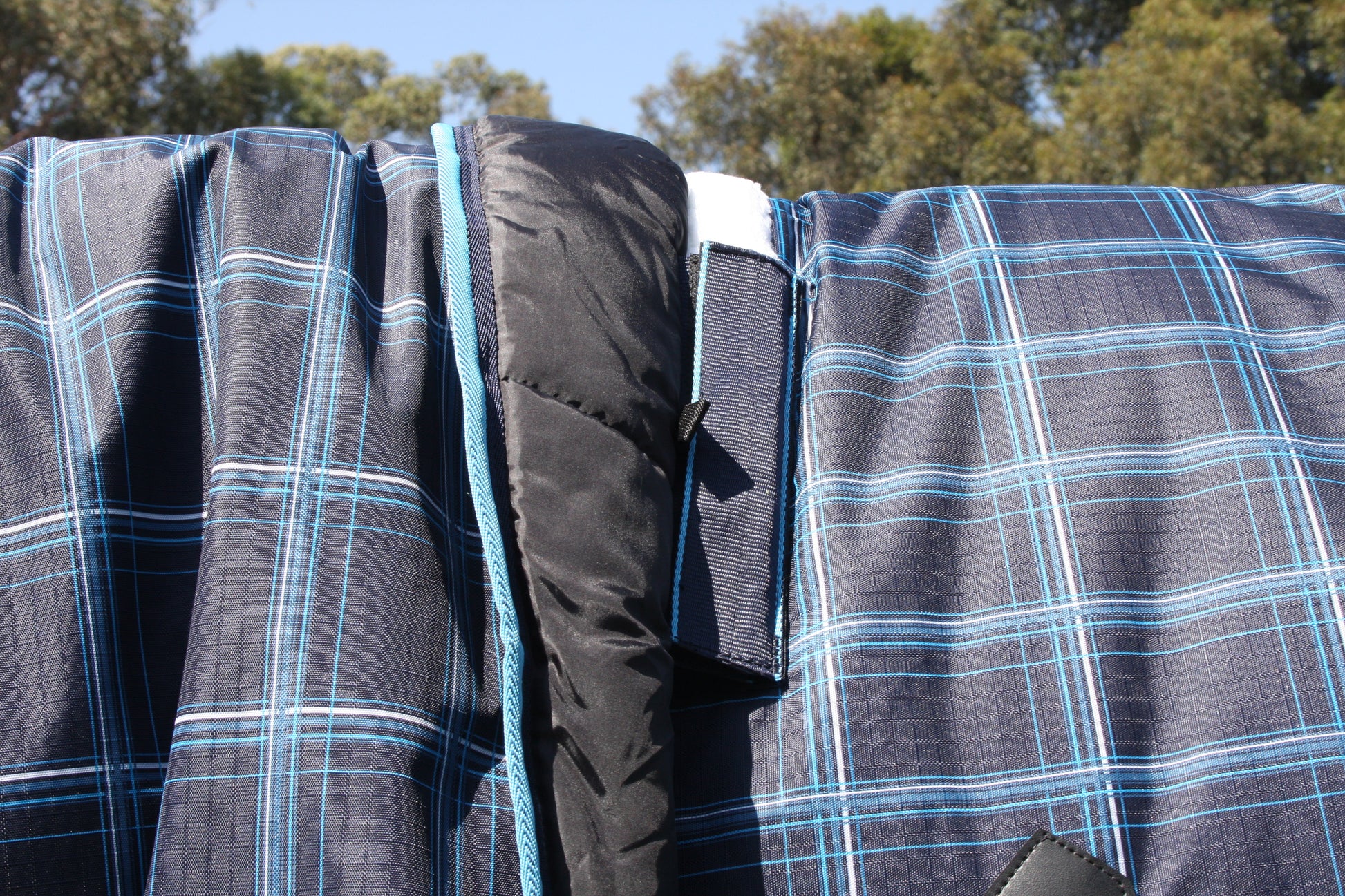 We use heavy duty stainless steel plated buckles and fittings, and rubber stoppers on the surcingle buckles to stop them from coming undone. Quality webbing is used to ensure the longevity of the fittings. Velcro fittings on the detachable neck have a double locking system to ensure it is attached securely and safely, when done back up it also keeps the velcro clean whilst not in use.